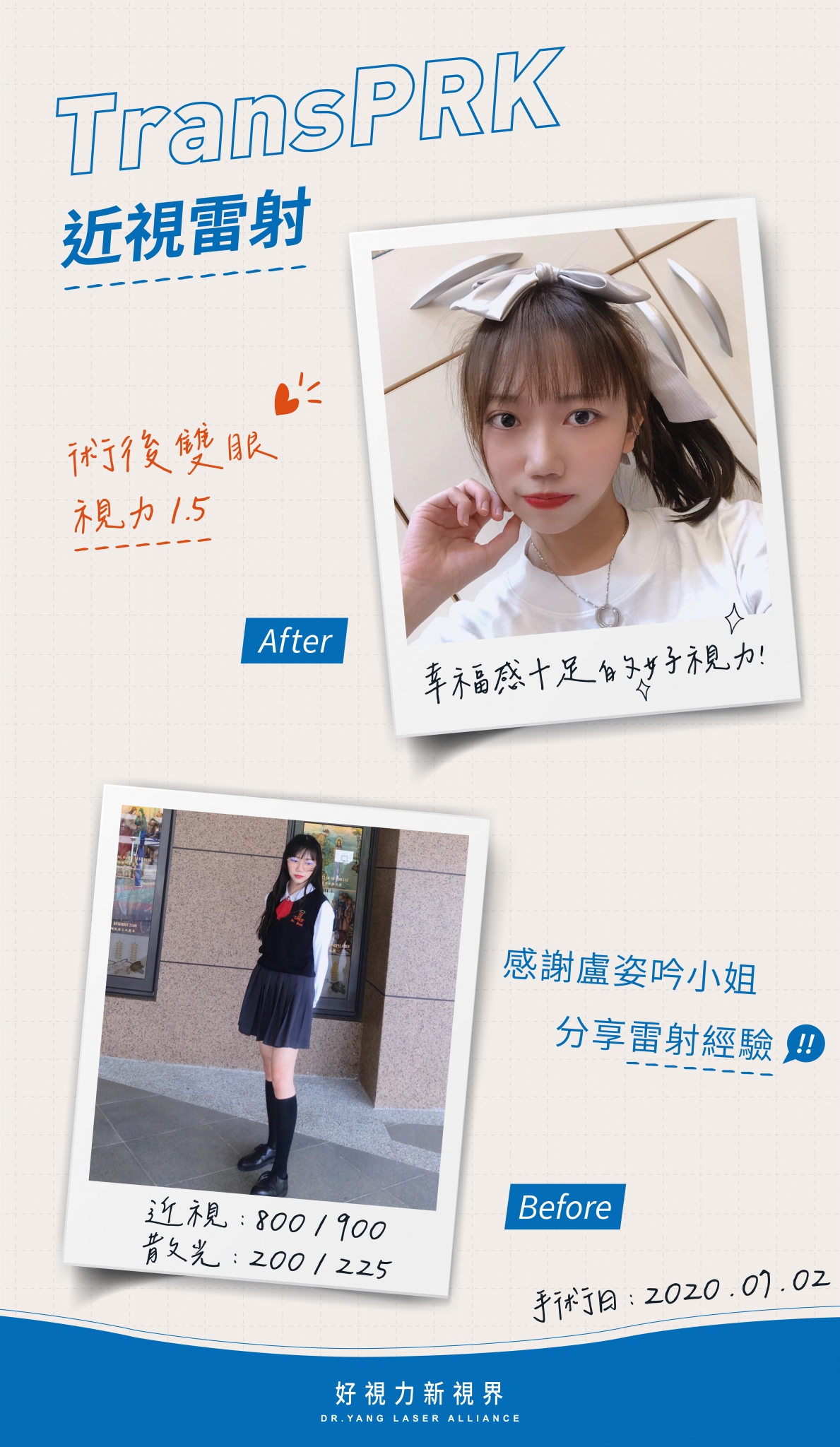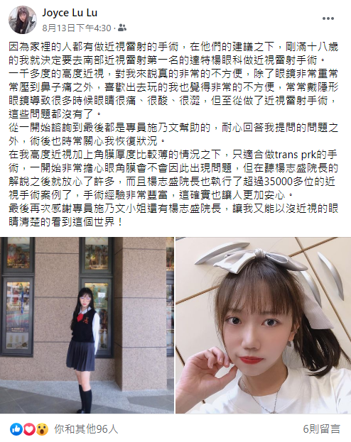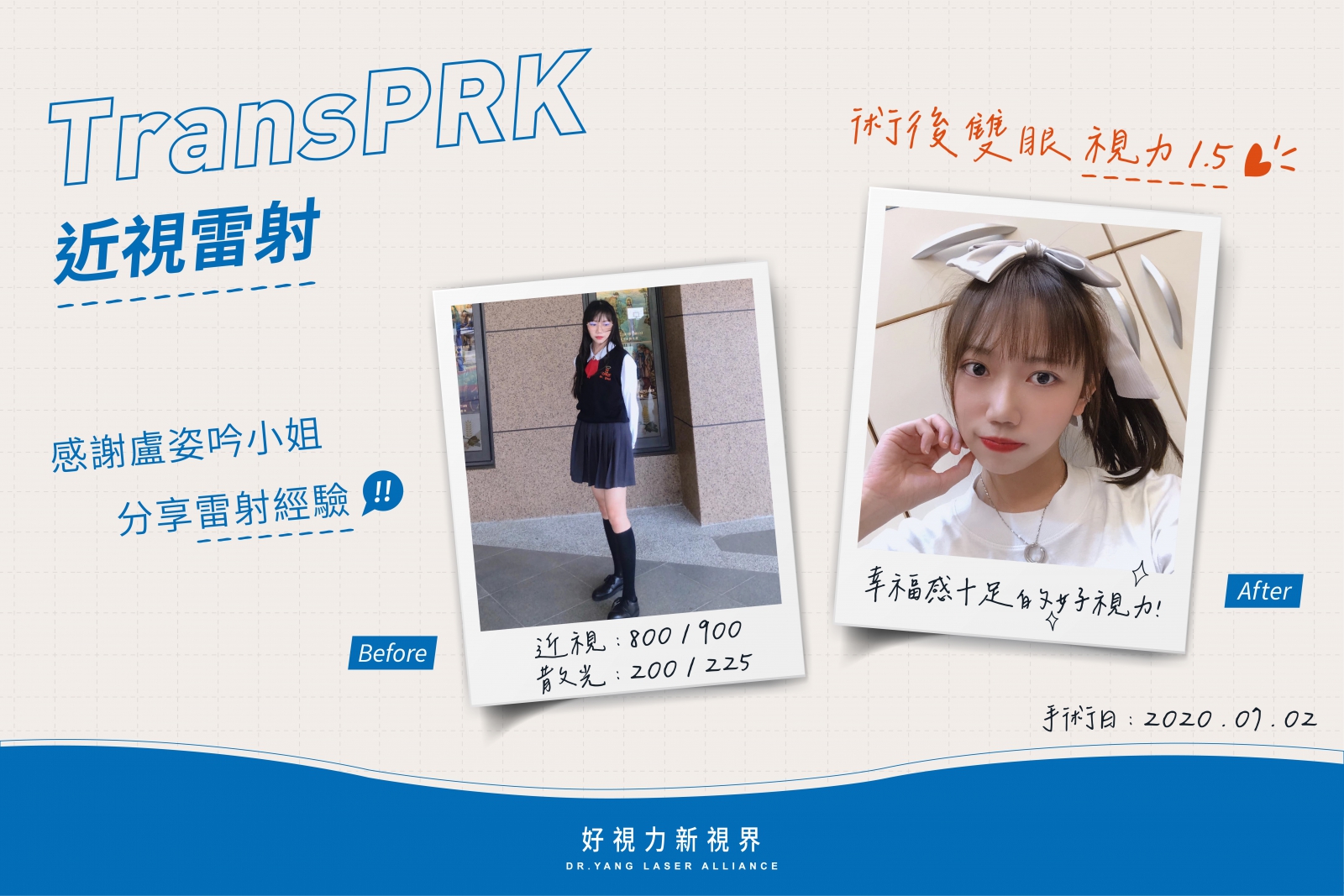 在我高度近視加上角膜厚度比較薄的情況之下,只適合做Trans PRK的手術,一開始非常擔心角膜會不會因此出現問題,但在聽楊志盛院長的解說之後就放心了許多,而且楊志盛院長也執行了超過35000多位的近視手術案例了,手術經驗非常豐富,這確實也讓人更加安心。